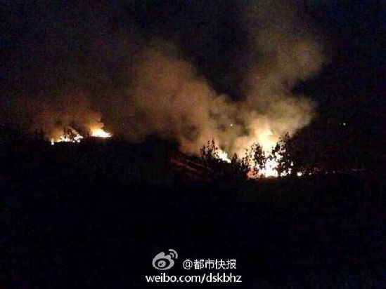 据悉,失事现场由军方接管,现场已全部封闭。图为图为飞机坠落现场,火光冲天。