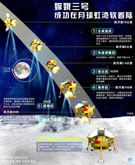 落月是从15公里高度开始的。大约11分钟的落月过程中,嫦娥三号依靠自主控制,经过了主减速段、快速调整段、接近段、悬停段、避障段、缓速段等6个阶段,相对速度从每秒1.7公里逐渐减为0。在距离月面100米高度时,探测器暂时停下脚步,利用敏感器对着陆区进行观测,以避开障碍物、选择着陆点。在以自由落体方式走完最后几米之后,平稳“站”上月面的4条着陆腿触月信号显示,嫦娥三号完美着陆月球虹湾地区。