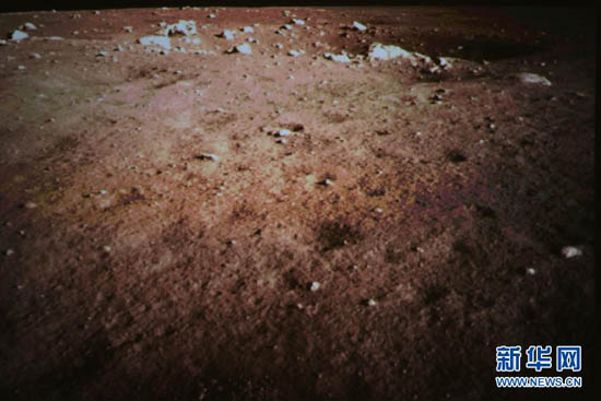 12月14日,嫦娥三号平稳落月,中国首次地外天体软着陆成功。这是北京飞控中心大屏幕上显示的嫦娥三号探测器监视相机传回的月球表面照片。新华社记者王建民摄