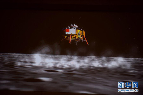 12月14日,嫦娥三号平稳落月,中国首次地外天体软着陆成功。这是北京飞行控制中心大屏幕上显示的嫦娥三号探测器。 新华社记者金良快摄