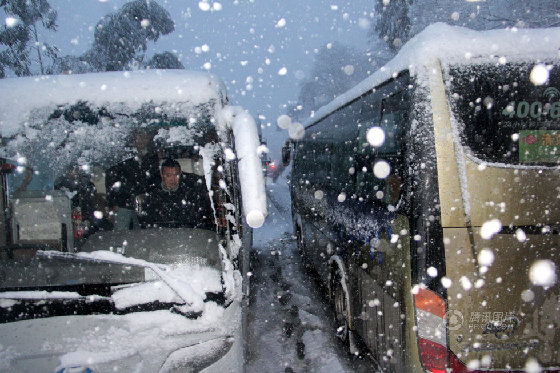15日下午2点起,由于大雪原因,宁凤线(原大丽路)全线20余公里出现积雪结冰现象,路面能见度极低,车辆无法通行,造成1400多人被困路上20小时。12月15日傍晚,云南大理,大客车冒着大雪经过洱源县境内。(陈丽萍 摄)