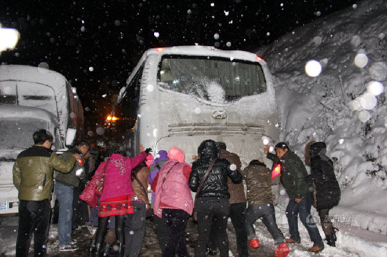 12月15日晚上,大巴车上的游客帮忙推车。截至记者发稿时,被困人员已经得到救助和妥善安置。(陈丽萍 摄)