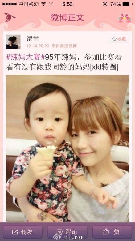 近日,网络上掀起一股晒辣妈照的比拼,其中,一大群94、95、96年的妈妈闻讯来参赛,网友看罢直呼:学妹们都成辣妈了。图片来@大大DIKE