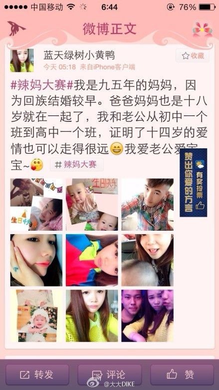 网友“蓝天绿树小黄鸭”是“95后”妈妈,她称:“因为回族结婚较早,我的爸妈也是18岁就结婚了,而我和老公从初中一个班到高中一个班,证明14岁的爱情也可以走得很远”。