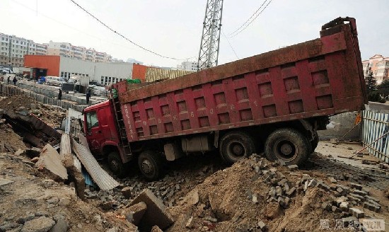 刘公岛路附近一爆炸点一辆受损的货车仍停在爆炸坑里。
