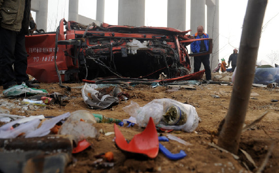 沪陕高速蓝田玉山段发生一起车祸,一辆大货车在行驶途中突然撞向高架桥护栏,导致车头坠下30米高的高架桥,货车司机当场死亡,车内的物品也散落一地。
