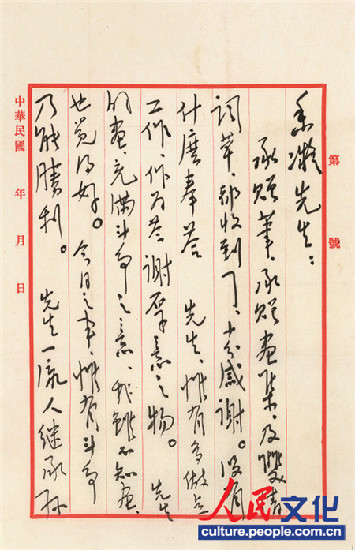 毛泽东一九三七年写给何香凝的一封信:“香凝先生:承赠笔,承赠画集,及《双清词草》,都收到了,十分感谢。没有什么奉答先生,惟有多做点工作,作为答谢厚意之物。先生的画,充满斗争之意,我虽不知画,也觉得好。今日之事,惟有斗争乃能胜利。先生一流人继承孙先生传统,苦斗不屈,为中华民族树立模范,景仰奋兴者有全国民众,不独泽东等少数人而已。承志在此甚好,大家都觉得他好,望勿罣念。十年不见先生,知比较老了些,然心则更年青,这是大家觉得的。看了柳亚子先生题画,如见其人,便时乞为致意。像这样有骨气的旧文人,可惜太少,得一二个拿句老话说叫做人中麟凤,只不知他现时的政治意见如何?时事渐有转机,想先生亦为之慰,但光明之域,尚须作甚大努力方能达到。敬祝 健康 毛泽东 六月二十五日”