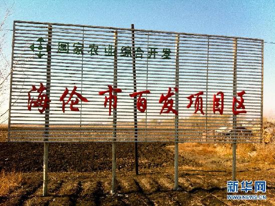 10月17日拍摄的海伦市一块农业综合开发项目的牌子。黑龙江省海伦市是全国“粮食生产先进县”和著名的“大豆之乡”。近几年,这个市一边四处“哭穷”申请国家扶贫开发工作重点县,一边变相投资近亿元兴建政府大楼,继去年成功戴上“贫困帽子”,今年又搬进竣工不久的“豪华衙门”。这种“穷”“奢”通吃、自相矛盾的做法,不仅造成不良社会观感,也引起当地干部群众质疑。海伦市一位主要领导向记者坦承,虽然已按中央“八项规定”要求,对政府大楼超标房间进行腾退,但群众路线教育实践活动的持续深入,依然令他们深感窘迫和不安。新华社记者 程子龙摄