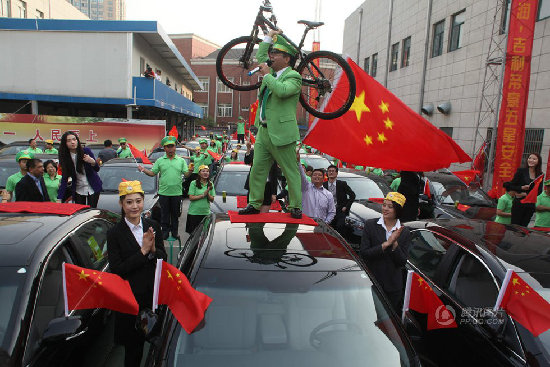 2012年10月10日,南京,陈光标举行以旧车换新车仪式,43个在抗议钓鱼岛事件中被砸的日系车主获得了陈光标赠送的国产吉利帝豪汽车。张玉军 摄