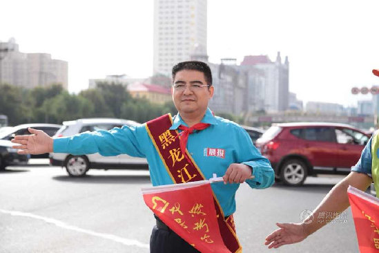 2013年8月23日,哈尔滨,陈光标戴红领巾、持小红旗,在街路路口引导行人有秩序地过马路。黑白灰 摄