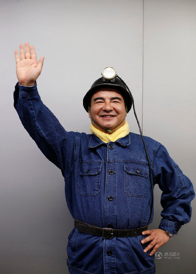 2013年3月14日,北京,旁听两会的陈光标在记者面前穿上矿工服、带上安全帽和矿灯,他表示自己将要为550万煤矿工人代言。李拓 摄