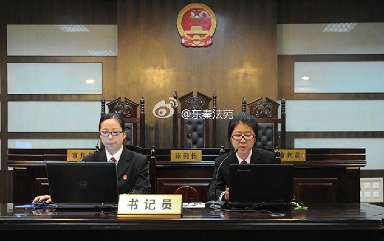 12月30日上午9时,渭南市中级人民法院在二楼大法庭公开开庭审理张淑侠拐卖儿童一案。图为书记员正在宣读法庭规则。(来源:人民网)