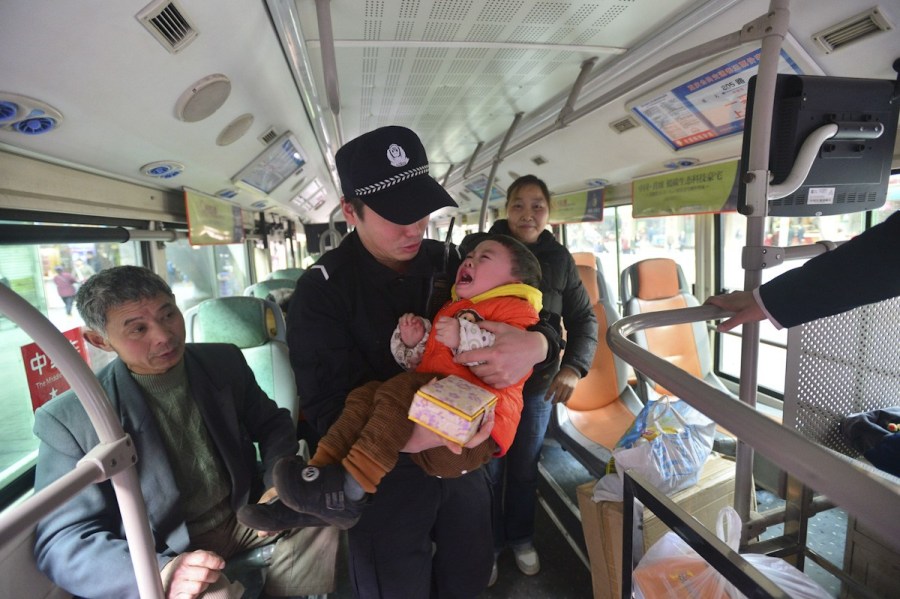 2013年12月12日14点30分,重庆市沙区南开中学附近805公交车上,一位实习警员将两岁半的小帆帆抱下公交车。20分钟前,小帆帆因与爸爸妈妈走散以后,独自登上公交车,805驾驶员与乘客一起“赖站”等候15分钟后,报警求助。目前,小帆帆已与家人团聚。