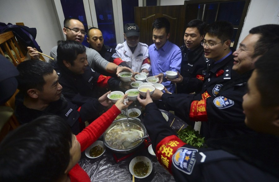 2013年12月24日,重庆市沙坪坝区渝碚路派出所,当天值班的民警在晚饭上“干杯”,相互祝愿来年平安幸福。