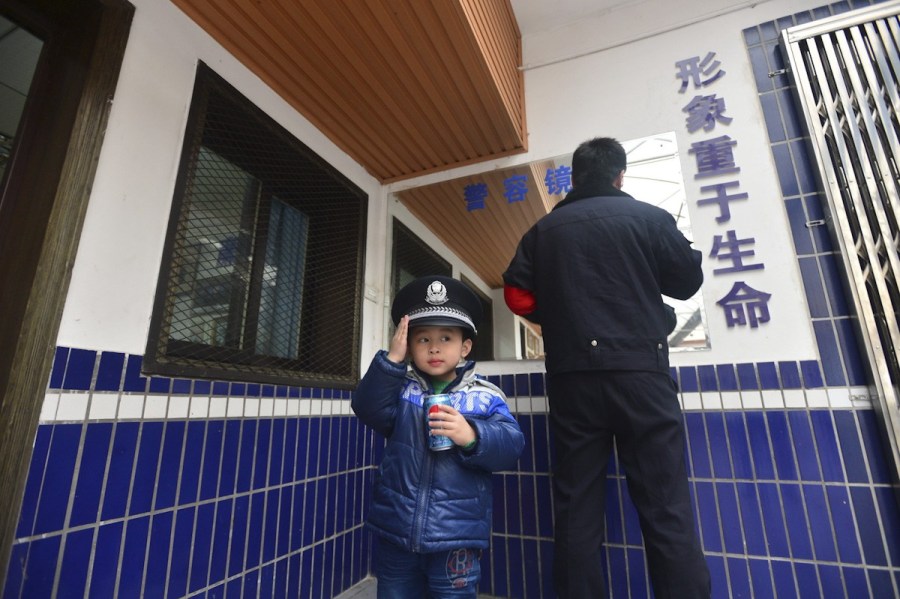 2013年12月3日16点,重庆沙坪坝区渝碚路派出所,在派出所长大的“光头强”(图中小孩)正在模仿一位镜前整理警服的年轻民警。
