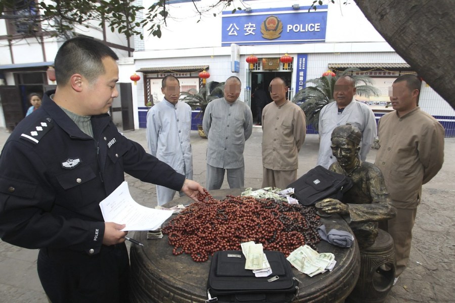 2013年2月13日,重庆市沙坪坝区磁器口,几名冒充僧人的无业人员利用假“佛珠”行骗被民警带回派出所调查处理。