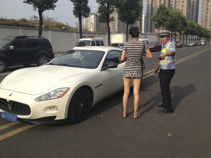 2013年8月9日,重庆,一个穿着黑白横条纹T恤、牛仔短裤的姑娘赶到违章停车现场,承认这是她的车。交警正对其批评教育并进行处罚。