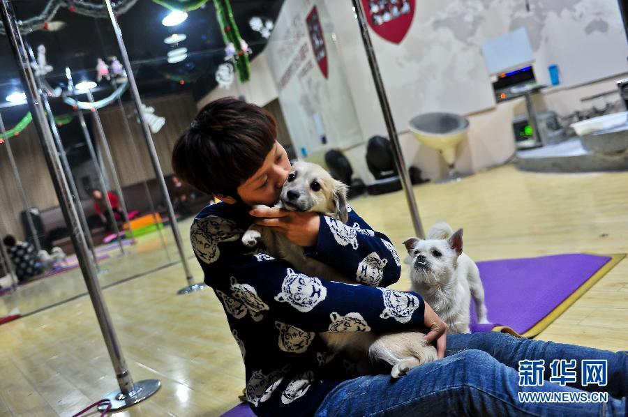 队员方艺在天津中国钢管舞训练中心和自己养的两只小狗玩耍,她说,这是她训练之余最大的乐趣。