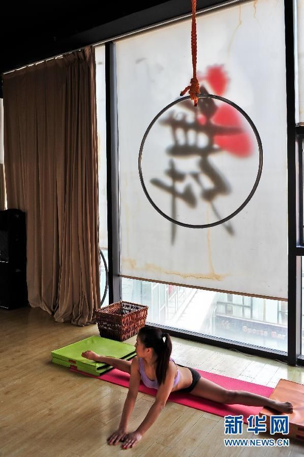 队员何碧在天津中国钢管舞训练中心进行压腿训练。