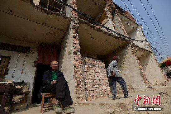 2014年1月2日,广西南宁市,长堽路扩建路段两边出现了两排之前因为拆迁遗留下来的“危楼景观”楼房,路边很多楼房都是只拆掉一半,另一半没拆掉的就像危楼一样依然矗立在那里。西川 摄