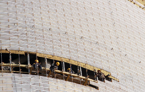 工人在为人民日报新大楼的外层安装白色的琉璃棍