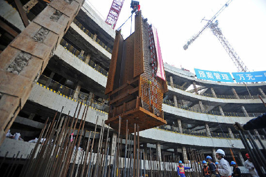 武汉吊装首根70吨钢巨柱 现场绑活鸡祭祀
