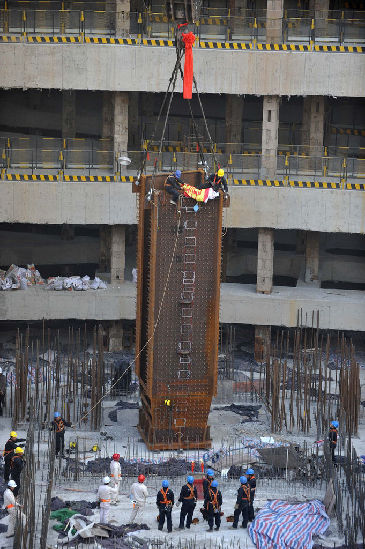 武汉吊装首根70吨钢巨柱 现场绑活鸡祭祀