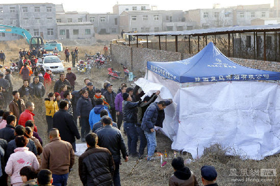 2014年1月4日,西安,老人尸体被抬出机井后,村民将其抬进附近简易棚内。现场的民警说,老人没有落入水中,很有可能是缺氧致死的。围观的村民得知老人在井内被悬架着时,唏嘘不已:在生命的最后时刻,在黑暗的井里,不知老人遭受了怎样的折磨……
