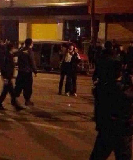 绑匪忽然从车上下来了,将女孩挡在自己身前,用匕首抵着她的脖子,要求警察赶快安排好车。民警一边说“车马上安排好”,一边悄悄安排民警绕到绑匪身后。一位长沙民警抓住机会,突然从绑匪身后冲过去,猛抓住他持刀的右手。几乎同时,十多名民警冲上来,夺下匕首,将男子按在地上,同时把女孩拉开。图为绑匪挟持周倩,民警将周围封堵。图事发现场。