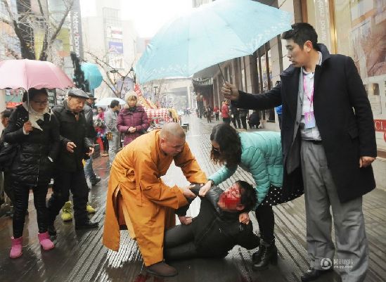 2014年1月8日,一名男子在浙江省金华市区西市街上突然发病跌倒地上,脸部受伤血流满面。恰好路过的金华智者寺的僧人及金华某商场的员工见状立即上前进行救助。