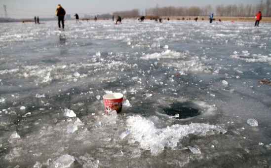 北京千人凿冰钓鱼 大量垃圾冻在河面