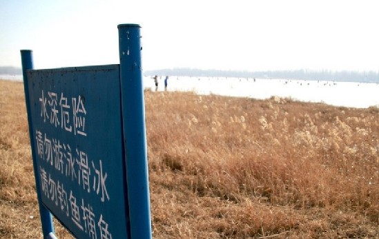 冰钓河段每隔五十米即树立一个禁止钓鱼捕鱼的警示牌。