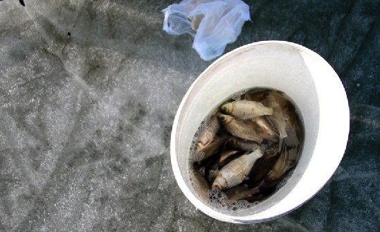 一名冰钓爱好者在潮白河顺义段冰封的河面上钓到的鱼。