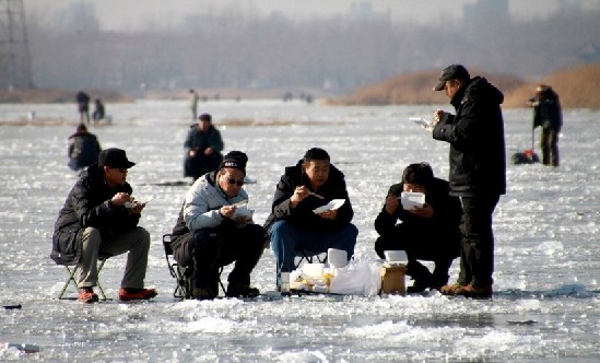 五名冰钓爱好者在潮白河顺义段冰封的河面上吃午饭。