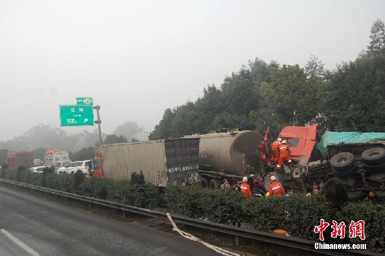 1月12日,沪蓉高速四川广安境内南充至广安方向岳池出口500米处发生一起15车连环相撞的交通事故,导致2人死亡,8人受伤。事故发生后,高速交警封闭了事故路段,消防、120急救医护人员迅速赶往现场展开救援。目前,事故中的伤者已送往当地医院救治,事故具体原因正在调查中。图为事故救援现场。中新社发 杜川 摄