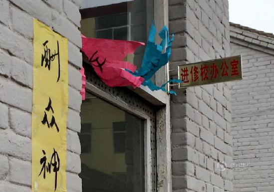 2014年1月2日,山西五台县教师进修学校内,“进修校办公室”门口,贴有不久前“谢土”仪式上求得的“符贴”,门框上方的彩色挂贴上仅剩有“季”、“安”两个字,门框一侧的对联写有“酬众神永保太平”。该校不久前曾举办过“谢土”祭拜法事。