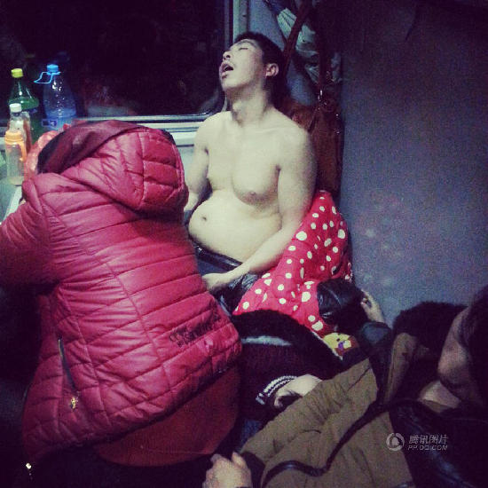 2014年1月8日晚上9点20分从杭州始发,10日凌晨3点46分抵达贵阳的临客L199次列车。到了夜晚,车厢里的人们睡得东倒西歪。(许康平 摄)
