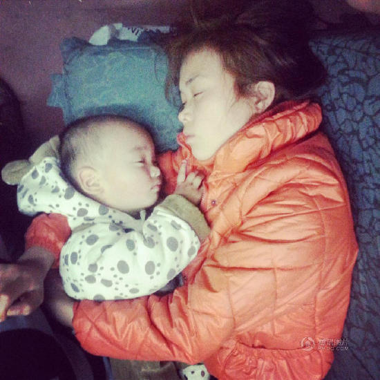 凌晨一点多,在车厢内,大家都东倒西歪地睡着。许多年轻人手中都抱着可爱的小孩子。