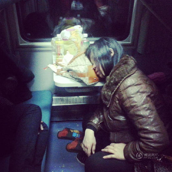 到了夜晚,车厢里的人们睡得东倒西歪。