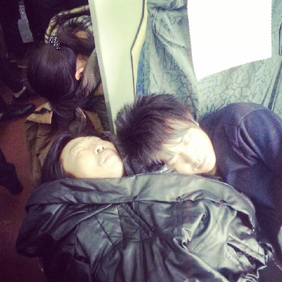 到了夜晚,车厢里的人们睡得东倒西歪。