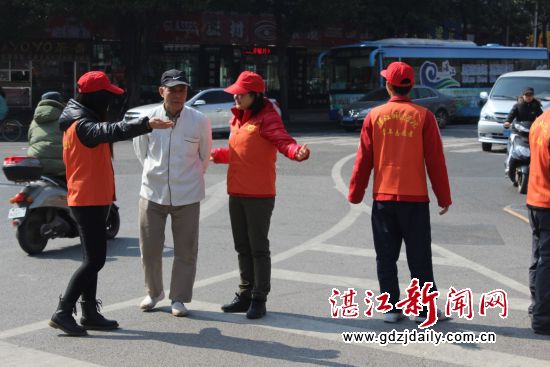 1月14日中午,这群志愿者首次“走马上任”。7位志愿者前往霞山的附属医院路口,18位留在赤坎世贸。他们带上黄色的志愿帽,穿上志愿服,看起来英姿飒爽。世贸购物中心路口一向交通混乱,车辆行人不按规则出行。志愿者开始时有些腼腆,不好意思向路人宣讲交通法规也敢上去阻止违规出行者。逐渐的个别志愿者上去向不走斑马线的路人讲解不按规定横穿马路的危害,另外的志愿者则大胆拦下逆行的自行车或电动车,耐心地指出不该逆行。交通文明志愿者的工作得到大部分市民的支持,被提醒的违规出行者大都不好意思地笑笑并表示为了自己及他人的安全以后将认真遵守交通规则。