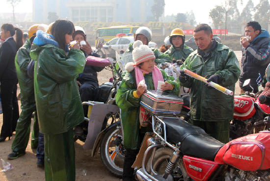 2014年1月19日,在粤桂交界的广西梧州市藤县春运服务站,几位穿着统一颜色、款式雨衣的返乡摩托车手正在修整。