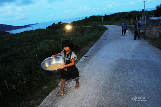 2011年8月8日,夜幕下,老人开始收拾农具,懂事的孙女吴思慧也帮爷爷奶奶分担点体力活。苏巧将/摄