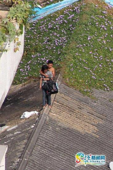 男子准备从房顶走下,房屋下的武警正在进行埋伏。(三亚新闻网记者邓松摄)