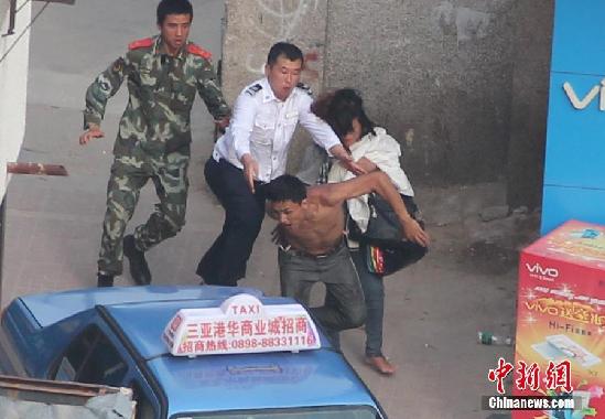 16时30分左右,林某劫持人质走下楼梯,一手拿菜刀,一手牢牢卡住女友的脖子,沿着走道向车辆靠近。当林某用拿菜刀的手打开车门的瞬间,躲藏在堆积物后面的参谋长徐正晓将其扑倒在地,另一名特战队员迅速将菜刀夺下,其余特战队员一拥而上将其牢牢控制住,成功解救人质。图为男子被制服瞬间。中新社发 周君 摄