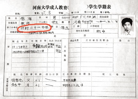 这是张海1988年在河南大学时的学籍表和学籍照片,当时张海14岁。张海初中毕业于开封市第13中学,但红圈处清楚地表明他把自己毕业的母校改为第21中。