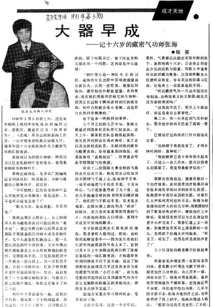 原本在开封地盘“发展”的张海,归入夏日东门下后,他开始了从一个单纯的具有“特异功能”的气功大师向“藏密大师”的转变。张海自己说,他是13岁的时候到西藏去拜夏日东为师的。按照他1974年出生的说法,这个时间应该是在1987年,但此时,张海尚在开封市十三中学读初中二年级,“特异功能”尚未显露。图为90年代初《妇女生活》对张海的报道