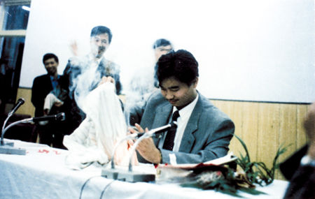 孙岭回忆,当时张海在湖北福慧山庄开办藏密高级班,每人几百元的学费。而张海后来组织的到五台山的“灌顶活动”更是场面宏大,信徒达到数万,每人都有“施舍”,刨除了场地租赁费等各种费用之外,张海收入颇丰。“当时,一年几十、上百万,应该不是问题。”孙岭说。 图为张海在表演“魔术”,丝巾开始着火冒烟。