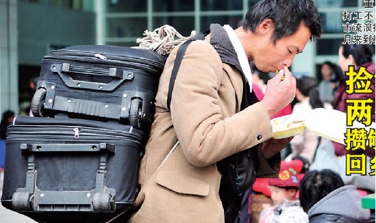 去年6月,重庆男子尹大伦怀着“打工梦”来到古田,但因交不起5000元押金,第二天就被工厂赶了出来。身上只有6.2元的他,试图沿着公路,徒步走回重庆,在接下来近5个月的时间,他从古田步行流浪到屏南、政和、建瓯、福清、莆田等9个县市。去年11月9日,他辗转来到福州火车站。从那天开始,他“住”在了火车站,吃旅客吃剩的食物,捡大家遗落的1毛、5毛硬币,终于在2个多月时间里,他攒够了钱,成功买到了一张价值224元、1月29日从福州开往重庆北的无座火车票。尹大伦在垃圾桶中找到了一盒别人吃剩的盒饭开始吃起来。