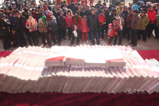 2014年1月20日,济南长清区万德镇灵岩有机茶园,近百万大钞现金“堆积如山”,村民正排长龙领取现金,脸上流露出笑容。(依旧 摄)